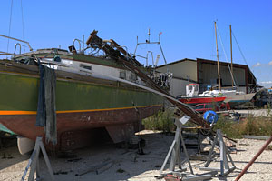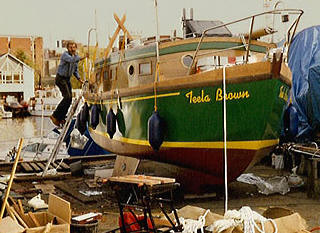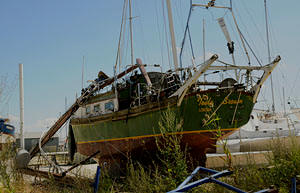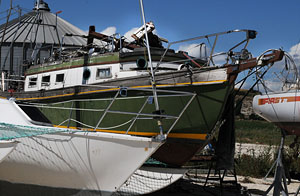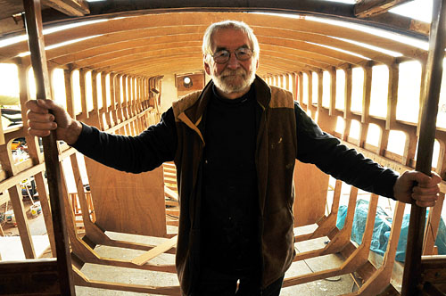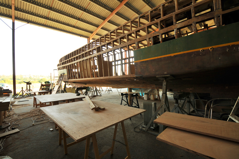 She was over 30 years old when we bought her. Teela Brown, aka Boat of the Boat, People and Me series of books, had become, by then, a renovation project. As is the way with wooden boats parts of her were in perfect condition and parts a disaster. I applied much ergonomic re-think to the restoration all of which worked out fine. We lived on Boat for 15 years and covered some 50,000 nautical miles. But for all the work we did on her Boat was someone else’s design. We just made the design work for us. When we were living on Boat we talked and thought a lot about what People calls a Green House Boat or a Greenhouse Boat. Solar powered, live aboard “houseboat” capable of voyaging on canals, rivers lakes and coastal waters. At core a boat for the changing climate, sea level rise and all. We would have liked to build a prototype but the funds never came our way, and other solar and hybrid projects pushed the Greenhouse Boat aside. After a stay of 18 years ashore in South West France, we recently decided to go back on the water. Looking through lists of boats for sale suited to our advancing age - boats for canals, river boats and coastal boats - we found little that appealed and nothing, not even “projects”, that fit our likely budget once our house is sold. “How about we resurrect Boat? After all, Uncle Maurice (her designer) did refer to her as a barge yacht. I'll just cut her in half, pull her apart by, say, just under 5 metres (two sheets of plywood) and fill in the gap? Could probably have her back in the water all bright eyed and bushy tailed for €30,000. There's nothing in the For Sale columns to match that..”A tempest settled matters. We hurried down to the Port Sur le Rive boatyard at Mortagne sur Gironde. We found that the neighbouring trimaran had been blown over. The multi-hull had settled across Boat, breaking her mast and boom in half, tearing the mast tabernacle out by the roots and leaving a gaping hole in her cabin top. Even so, Boat seemed remarkably sound after so many years of embarrassing neglect. We could see just how and where to lengthen her. We could already imagine the new hybrid 14 metre sailing barge, we luxuriated in the new internal living space while relishing the idea of keeping the cockpit and foredeck as is, pretty much just renovating paintwork. It was decided, there and then. The LongBoat is a design exercise more than a renovation project. Everything is new or changed apart from the cockpit, which I already had completely re-created with extensive modification while in Fort Lauderdale in 1991. Outside, the cabin sides are radically altered so that we can walk along a narrow side deck while in locks or when mooring. By our standards (once was a 9.1m, 30 ft., boat) the cabin is now huge and long although no higher than before. Result is a longer, sleeker, more "bargey" look. Nothing wrong with that. Sailing barges were the workhorses of coastal as well as canal and, especially, river fleets before the advent of steam and diesel. Underneath, the main ballast keel is unaltered. I had added a tonne onto it while in Florida. The new rig will be twin masted schooner, low profile, short masts 7-8m and long booms. The old keel is enough for stability. The twin bilge keels are being extended by 50%. With a draft of only 1m the bilge keels are critical for directional stability, counteracting leeway, and for preventing the dreaded rhythmic rolling, and, when the tide goes out, to allow such a long boat to stand the ground without falling over or breaking her back! Inside, all is change, all is new apart from the old chart table and the essence of the galley which served us well and served up great meals for our friends for fifteen years. It is now possible to walk round most of the double bunk in the bow. The head or “vestiaire” and shower is 50% larger. The hanging wardrobe opposite 50% longer. I have my own office both sides of the companionway, with desk, computer, etc. on one side, three scanners and A3 printer on the other side for my photographic work. Moving on aft, People has an equal sized office to do in whatever People does. Magical things with websites, paints and pastels, ropes and threads and cloths. Next comes a kind of stand around, walk around space with a small modern log burning, cast iron stove ala “Thames Barge” style. And on the opposite side we're still considering a Refleks oil (sorry about that) stove and heater for 3 radiators and hot water. It is a quandary. (Some days we're against it, and some we're resigned to it. We do want to sail north. Far north.) Continuing aft are the two settees, the banquette with our beloved fold out cabin table – glowing rich mahogany. As before, the companion way and cockpit steps separate the now more spacious navigation station, chart table and video screen from the extended galley. Internal goodies, apart from our working computer complexes and heating stoves, include stainless gimballed and fiddled two burner cooking stove with substantial oven. Good sized efficient fridge with freezer. Small but conventional washing machine and separate dryer. No dish washer or microwave. The first would be silly for mostly two people, and the second is tempting; could be used in a marina but impossible to power in the wild from our solar system. House power is similar to before, used to go a year without charging batteries. LongBoat will have two additional batteries making six 1 kilowatt hour 12 volt blocks and 400 watts of Solar power 20% efficient panels. Our old and usually reliable (except for one notable entire Atlantic crossing) 2-cylinder Volvo diesel engine would not be butch enough to push all 14m of LongBoat along with an occasionally required maximum of 8-9 knots. The maximum loaded displacement will now be about 10 tonnes. We need more drive. For the past 18 years we have been living in a farmhouse with five smaller houses on the grounds. The renovation and construction was seriously